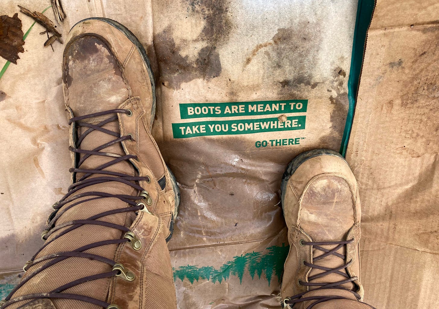 While moving some garden supplies recently, I noticed a message on the underlying cardboard: Boots are meant to take you somewhere. Go there.™